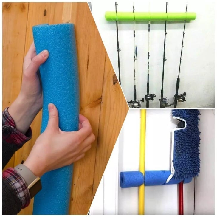 Pool noodles can be mounted horizontally on a wall and sliced in spots to create a holder. They can hold various items like brooms, fishing rods, and other accessories. Ensure these items are light, as pool noodles cannot support the weight of heavier objects. Also, be aware of the accessory’s length before placing them on the holder. Avoid hanging accessories on your pool noodle holders, as they are simply meant to keep the items steady while the bottom rests on the floor.